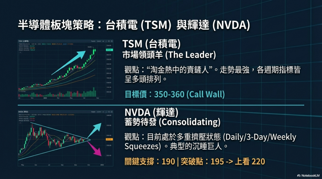 • TSM (台積電): 作為半導體行業的「老比爾縣雜貨店」(Shovels and Picks),其結構性優勢優於單一晶片商。目標位設定在 350−360。