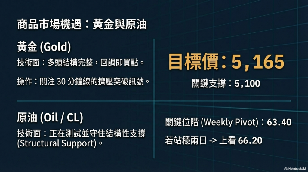 • 原油 (CL): 週樞紐位在 63.40 美元。若連續兩個交易日收於 66.20 美元以上,下一個結構性目標將直指 72.2 美元。