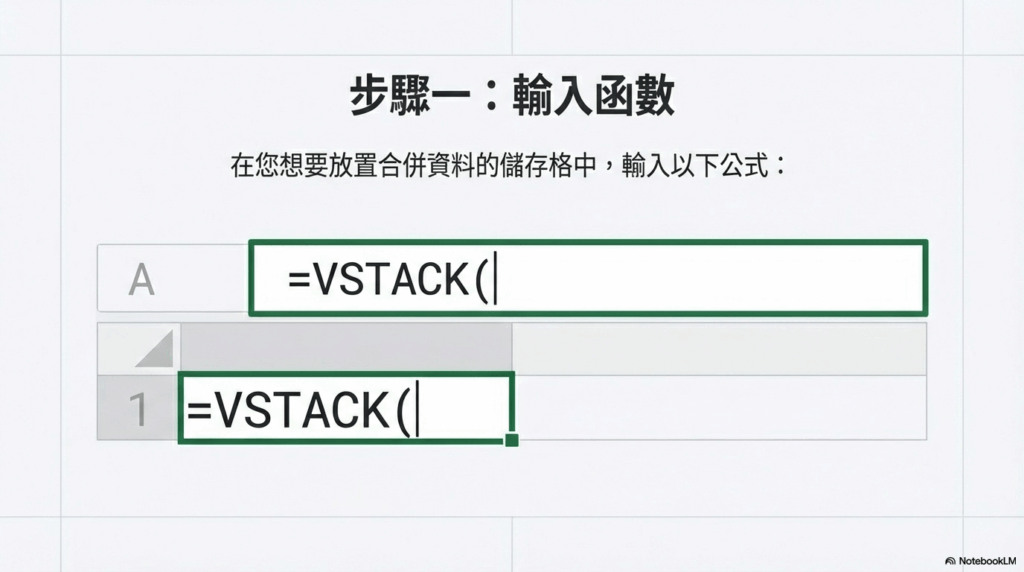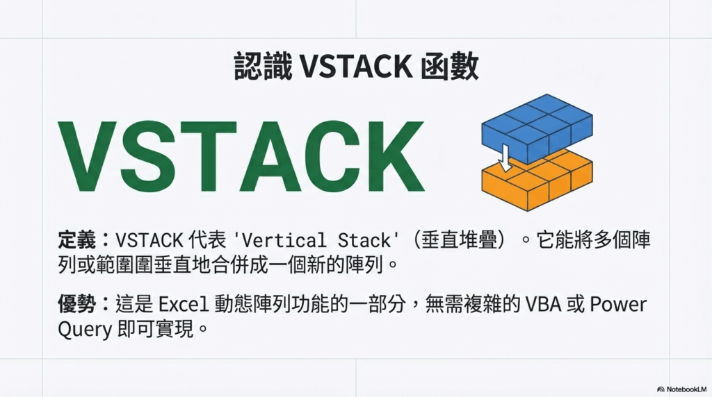 這個神奇的解決方案就是 VSTACK 函數。它是一個強大的工具,能將來自不同範圍的資料垂直堆疊(Vertically Stack),快速整合成一個單一、連續的表格。