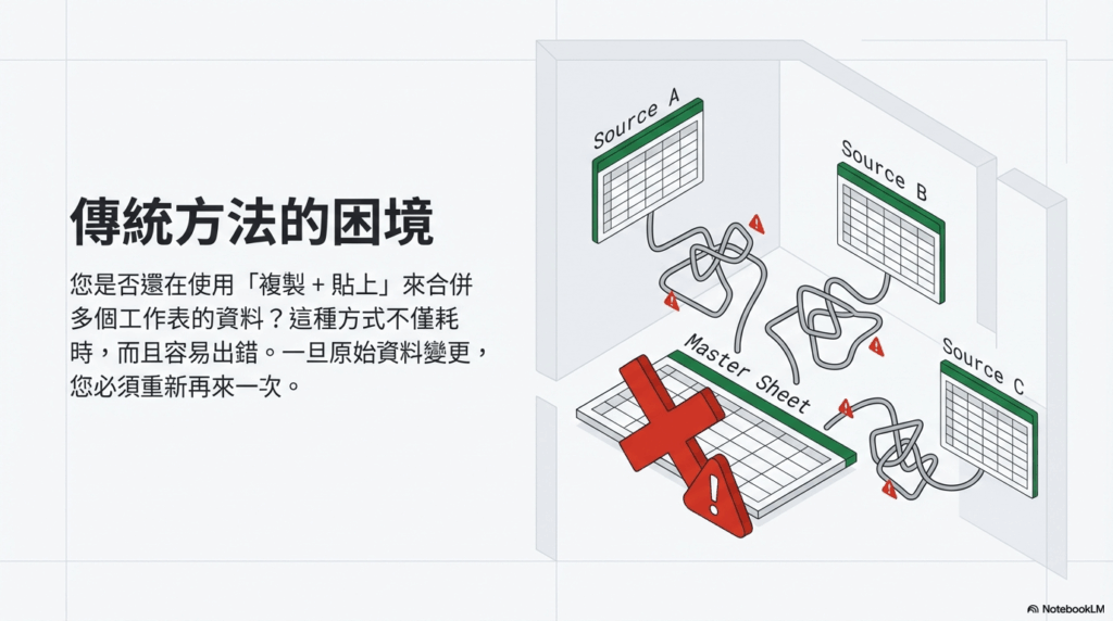 在處理試算表時,我們常需將來自不同工作表或檔案的資料彙整至一張總表。許多人的直覺作法就是逐一複製、貼上,這不僅極度耗時,更糟的是,這個過程充滿風險,容易引入難以追蹤的人為錯誤,或產生一份在你完成的瞬間就已經過時的靜態報告。如果你還在這樣合併資料,請馬上停止。本文將介紹一個更聰明、更安全的解決方案,徹底革新你的工作流程。