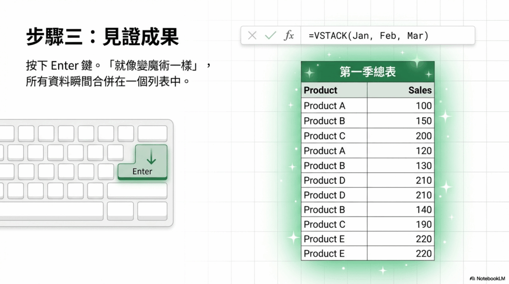 4. 步驟 3:完成! 選取完所有範圍後,按下 Enter 鍵。你會看到所有資料都被神奇地合併在一起,形成一個乾淨整齊、並且會自動更新的動態表格。