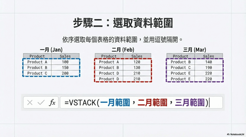 2. 步驟 2:選取範圍 接著,依序選取各個表格的資料範圍(不包含標題列),並用逗號隔開。例如,如果你的第一季銷售額在儲存格 A2:D50,而第二季在 F2:I80,你的公式就會是: =VSTACK(A2:D50, F2:I80)